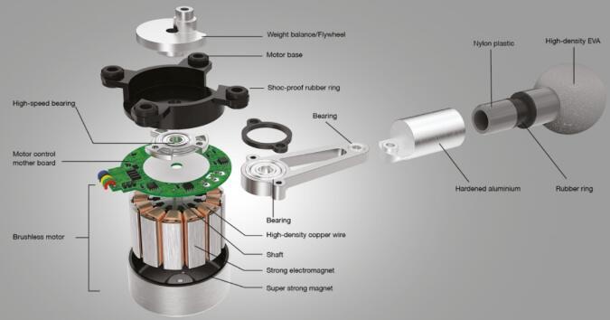 筋膜枪其实就是一种由电机驱动的电动工具,其内部核心部件就是电机,电机驱动轴承转起来后,通过偏心轮与连杆结合,将旋转运动转变为前后往复运动,再驱动按摩头,从而产生震动,这其实和电动工具中的曲线锯、马刀锯的机械原理基本一致,霍尔IC在膜筋枪中起到电机测速和检测电机是否工作的作用。