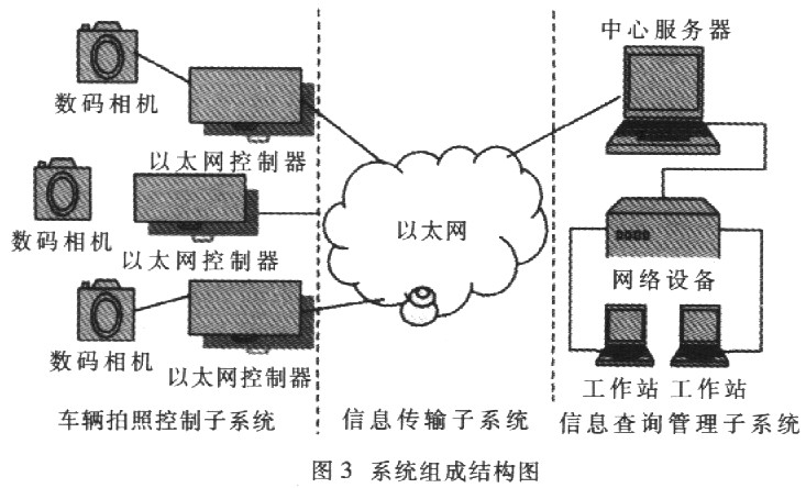 本系统由前端车辆拍照控制子系统、信息传输子系统和信息查询管理子系统组成。组成结构如图3。