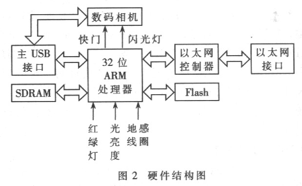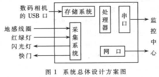 前端车辆拍‘照控制系统由嵌入式系统、微电脑芯片地感线圈检测装置、高精度数码相机、相关通信及传输附件组成。违章车辆闻红灯的瞬间,微电脑芯片根据检测地感线圈的信号变化,及时准确地发出车辆违章信号。前端嵌入式控制主机收到检测信号后(闯红灯、逆行等),对数码相机快门进行控制,并随时判断周围环境的光亮度决定是否开启闪光灯。数码相机接到闪光灯和拍照信号后进行拍照。所拍摄信息首先被存储在相机的8M卡(SMART Media Card)中。