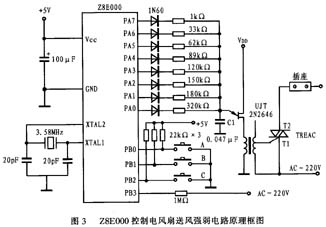 Z8PLUS特别适合于开发小型家用电器,以Z8E000制作的自然风电扇电路如图3所示,它能有规律的控制风扇送风的强弱。
