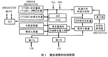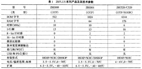 Z8PLUS系列单片机微处理器主要应用于小家电产品中。其结构框图如图1所示。系列型号及技术参数如表1所列。
