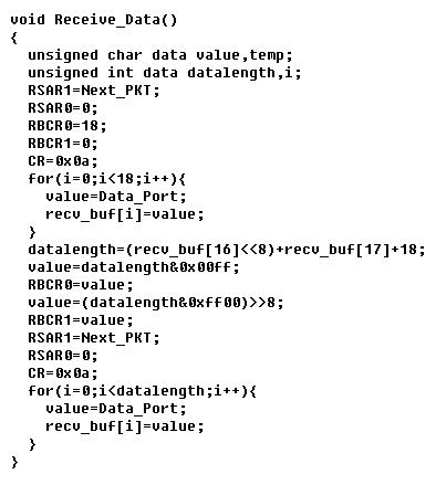 以下是接收数据帧的子程序,为了获得数据长度,我们先读入18个字节的数据,然后根据有效数据的长度将帧完整读入。为了启动远程DMA读操作,应该令CR=0AH,远程DMA将从接收缓冲环的DMA地址处读入1字节并送往I/O数据端口,由主机程序读入内存。这一过程将一直持续到RBCR寄存器为0。