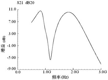 在输出网络的设计中,R1’越大,增益越大,Q1也越大,但此时R1就越小,输出网络带宽变小。由于高频段的设计是以1.9GHz为中心频率,输出网络的设计需使其具有足够的带宽覆盖1.8~2GHz,因此与L1串联的电阻R1的选取要使增益与输出网络带宽达到一定的平衡。