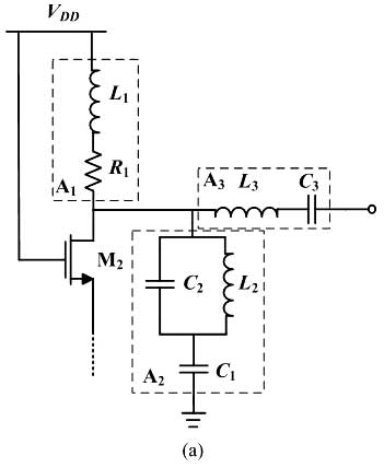 输出阻抗网络的设计与输入阻抗网络的设计类似,应考虑在多个频段下实现良好的匹配,同时输出级的设计还要满足增益的要求。图3(a)为本设计中的输出网络,其分为三部分, A1部分提供大的输出阻抗,以实现较高的增益;A2和A3共同实现双频带,A2负责阻抗下变换,将阻抗实部匹配到50Ω,A3则对虚部进行共轭匹配。