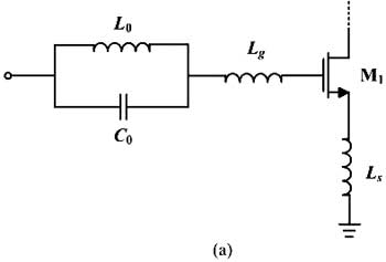 与传统的单频段LNA相比,本LNA的输入阻抗匹配网络必须同时在多个频段下匹配到50Ω。图2(a)所示为采用源端电感负反馈结构的输入阻抗匹配网络,其等效电路如图2(b)所示。其包括两个LC槽,其中,L0′=Lg+Ls,C0′=Cgs。输入阻抗可表示为: