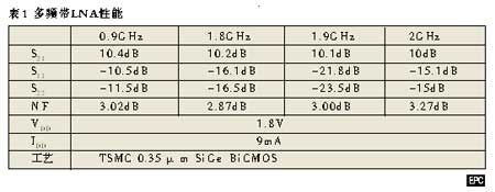 基于TSMC 0.35μm SiGe BiCMOS射频工艺库,采用Cadence的SpectreRF仿真器对所设计的多频段LNA进行仿真,得到0.9/1.8/1.9/2GHz四频段下LNA主要性能指标如图4所示。
