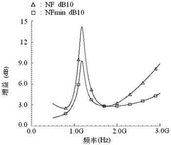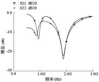本设计中ω1和ω2的期望值分别为0.9GHz和1.9GHz,满足这两种频率下谐振的元件值L0、L0’、C0、C0’将不止有一组。而在实际设计所采用的工艺库中,电感值是一系列分离值,因此必须结合实际电感值进行选取。最终实现的元件值是L0=7.23nH,C0=2.5pF,Lg=10.5nH,Ls=1.14nH。