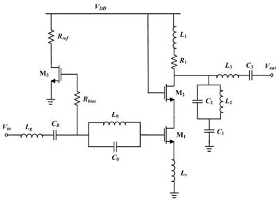 该多频带LNA总体电路如图1所示,由于1.8GHz、1.9GHz和2GHz频段很靠近,因此考虑设计一个0.9/ 1.9GHz的双频段LNA,以1.9GHz为中心频率,适当增大其带宽,使其覆盖1.8~2GHz,最终实现所需要的四频段LNA。