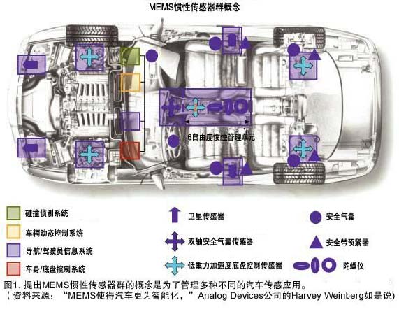 汽车惯性传感已成为另外一个热点。实际上,提议使用惯性传感元件组来管理大量的将用于车辆动态、导航、安全和电子转向应用的传感功能(插图1)