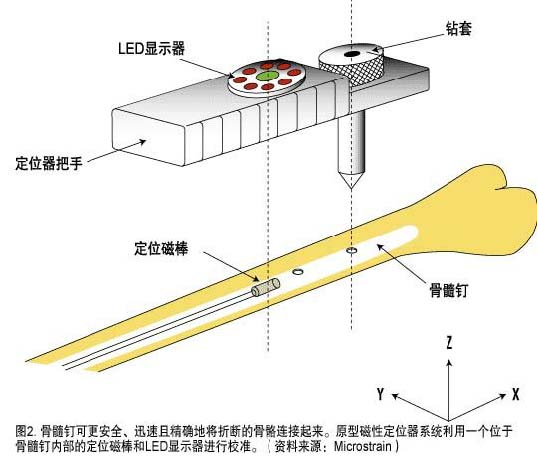 和精确性,且手术时间较长。所以在与Virginia Tech(www.vt.edu)Virginia 大学(www.virginia.edu)Carilion 生物医学院(www.biomedicalinstitute.org) Carilion Health Systems (www.carilion.com)的合作中,Triad Semiconductor(www.triadsemi.com)开发出骨髓钉(IMN),该骨髓钉能帮助整型外科医生安全、迅速且精确地将折断的骨骼连接起来。该集团的原形磁铁定位器系统采用了一个位于IMN 内的定位磁棒和一个LED 显示器(插图2)