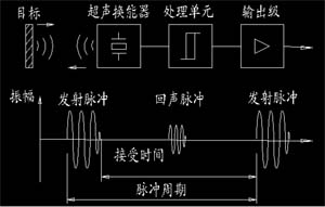 首先处理单元对超声换能器加以电压激励,其受激后以脉冲形式发出超声波,接着超声换能器转入接受状态(相当于一个麦克风),处理单元对接收到的超声波脉冲进行分析,判断收到的信号是不是所发出的超声波的回声。如果是,就测量超声波的行程时间,根据测量的时间换算为行程,除以2,即为反射超声波的物体距离。