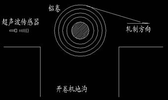把超声波传感器安装在合适的位置,对准铝卷卷径变化方向发射超声波,就可测量带卷表面与传感器的距离,经过处理可得到带卷的直径。