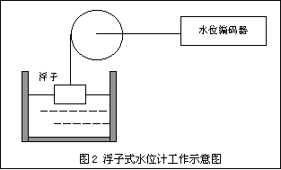 浮子式水位计的工作原理如图2所示,它利用液体浮力测液位的原理,靠浮子随水面升降的位移反映水位变化。漂浮通过绳索经滑轮与编码器相连,编码器的数字输出即为水位高度。为防止错码的出现,其编码器的编码为格雷码。