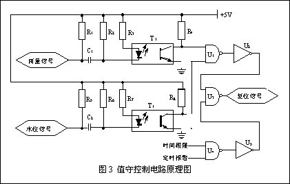 当雨量传感器的雨量值有增量(1mm)变化时,光电耦合器产生一低电平脉冲,通过与非门U1、反相器U2到与非门U3,U3输出一高电平脉冲复位信号到80C31单片机,使单片机复位,退出掉电值守状态开始工作,同时启动工作时间计数器计,在正常情况下,遥测站完成水情数据的采集、处理及数据传输任务后,重新进入掉电值守状态。如果由于干扰使遥测站的程序出现运行错误,在规定的工作时间极限内不能进入掉电值守状态时,工作时间计数器将发出一个时间极限的低电平脉冲,通过与非门U4、反相器U5到与非门U3,U3输出一高电平脉冲复位信号到80C31单片机,使单片机复位,重新开始正常工作。水位增量变化及定时报的工作原理与雨量增量变化和时间极限的工作原理相似。