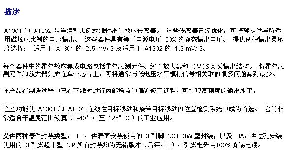 A1302EUA-T连续型比例式线性霍尔效应传感器(ALLEGRO代理商)技术参数查询报价0755-33062500 附技术资料 (PDF文档)