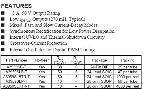 步进电机驱动IC 型号A3959SB技术参数查询(ALLEGRO代理商)报价0755-33062500