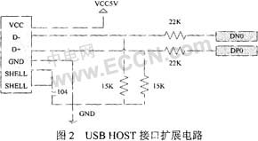 S3C2410处理器内部集成了USB HOST控制器,可以直接从CPU引线出来,而不需要添加额外的控制芯片,图2为系统的USB HOST接口扩展。S3C2410处理器可以支持两个USB HOST通信端口。