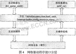 初始化程序完成硬件的初始化,device中变量的初始化和系统资源的申请,发送程序是在驱动程序的上层协议层有数据要发送时自动调用的。一般驱动程序中不对发送数据进行缓存,直接使用硬件的发送功能把数据发送出去。接收数据一般是通过硬件中断来通知的。在中断处理程序里,把硬件帧信息填入一个skbuff结构中,然后调用 netif_rx()传递给上层处理。