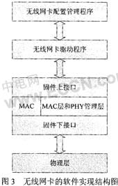 无线网卡的软件实现结构图如图3所示。固件是无线网卡上最基本的控制系统,主要基于MAC芯片来实现对整个网卡的控制和管理,并向下提供与物理层的接口,向上提供一个程序开发接口,为程序开发附加的移动主机应用程序提供支持。在嵌入式系统中,IEEE802.11提供的服务,包括认证、解除认证、登录、重登录等均由固件完成。