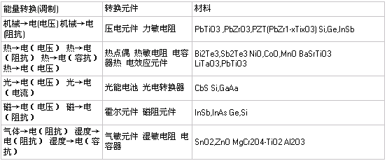 现代传感器制造业的进展取决于用于传感器技术的新材料和敏感元件的开发强度。传感器开发的基本趋势是和半导体以及介质材料的应用密切关联的。表1.2中给出了一些可用于传感器技术的、能够转换能量形式的材料。按照其制造工艺,可以将传感器区分为:集成传感器 薄膜传感器 厚膜传感器 陶瓷传感器。