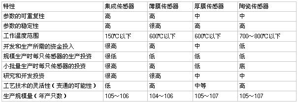 完成适当的预备性操作之后,已成形的元件在高温中进行烧结。厚膜和陶瓷传感器这二种工艺之间有许多共同特性,在某些方面,可以认为厚膜工艺是陶瓷工艺的一种变型 从列于表3中的比较中可知,每种工艺技术都有自已的优点和不足。由于研究、开发和生产所需的资本投入较低,以及传感器参数的高稳定性等原因,采用陶瓷和厚膜传感器比较合理。