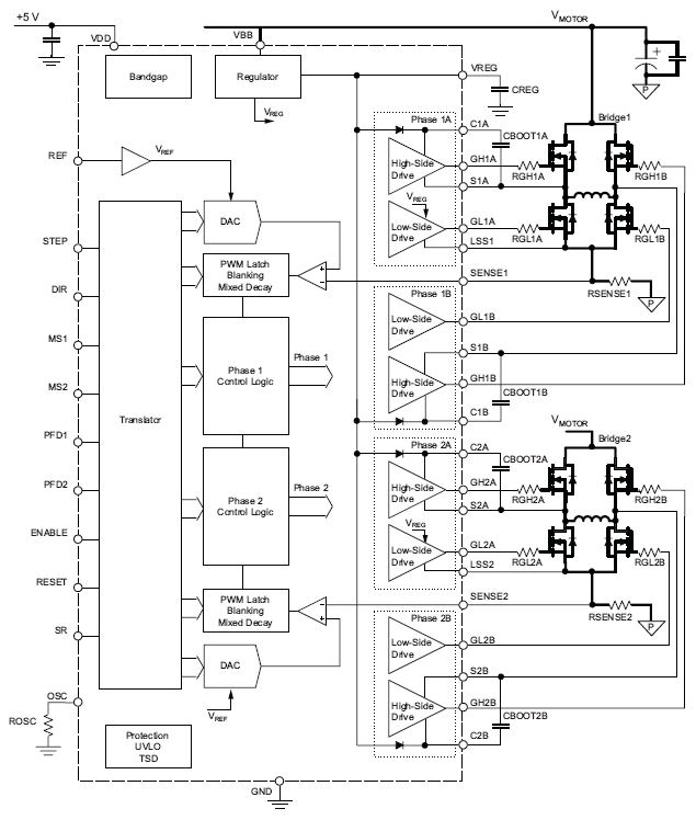 电机运动通过两线端口控制:步进短和方向端。可提供的细分模式有:全步、半步、四细分、十六细分。固定关断时间恒流控制器可设置为慢衰减、快衰减和混合衰减模式,用以降低电机的可闻噪音,增加步距角精度和减少损耗。