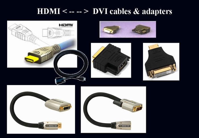( 图例中的DVI - HDMI适配器 可以让你在DVI接口的某端,利用原有的DVI接口,通过转接适配器而变成了 HDMI接口,针对“公的”或“母的 DVI或HDMI 接口,都有相应的转接适配器的,就这么简单。)