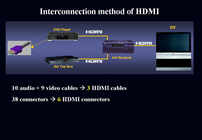 但是用于各式各样的/多类的家电产品, 采用HDMI 还是方便很多。以前传统的联接,是模拟信号(视频的分量信号,以及立体声双声道音频信号),或模拟信号(视频分量)+数字信号(音频的 SPDIF,光纤或同轴)传输。而新近的 HDMI 将会是完全数字信号传输了。