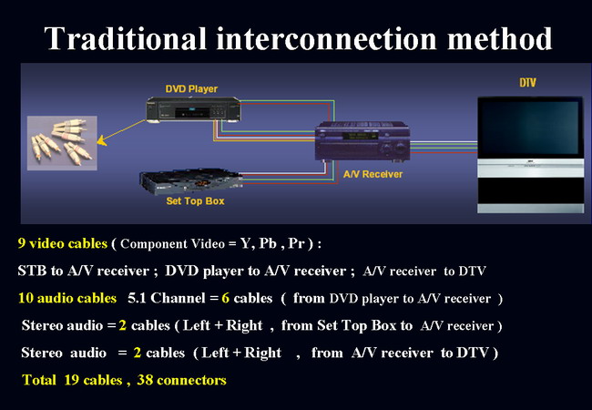 这样的传统的联接方法: 需要 19 根信号线(9 根视频线, 10根音频线) 38个联接处