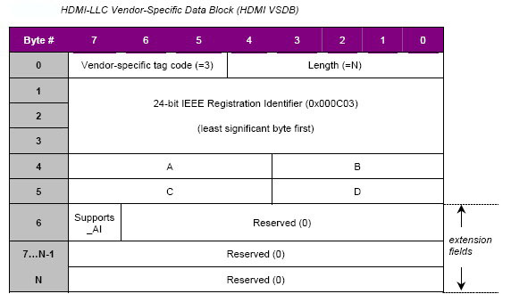 CEA EDID数据传输的第一个时序扩展段中要包含VSDB 信号。就是HDMI Vendor Specific Data Block (HDMIVSDB) . 这是一个 EIA/CEA-861B Vendor Specific Data 数据块。包含一个 24 位的 IEEE Registration Identifier 0x000C03, 一个 HDMI 批准、许可的数据值。为了测定接收端是否HDMI 设备,HDMI 源设备需要检测接收端设备的EDID 数据传输扩展时序中,是否存在这个 VSDB 数据块( 由 HDMI 设备制造厂商根据协议制定并提供的)。任何一个HDMI设备都会自动响应一个HDMI VSDB ,这是一个合理长度的数据表述 , 含及IEEE 注册、登记的标识符:0x000C03,只要HDMI 源设备接到这个标示符相关数据的响应,就将接收端设备认定为HDMI 设备。否则, HDMI 规范指定:任何接收端设备在 E-EDID 数据传输时不回传包含 这个HDMI VSDB ,即合理长度的HDMI 数据标识符(IEEE Registration Identifier )的响应。就会被认为所联接的是 DVI 设备。
