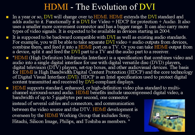 DVI的缺点是没有附带Audio音频联接,而且DVI的接口插座是沿袭以前的一些插座模式(例如什么P&D、DFP ...),显得有些大。大家都知道如今计算机多媒体常用的IEEE1394以及USB接口吧,都很小、轻灵。但它们的速度也不慢啊。DVI 的下一代继承者:HDMI 出现了,解决了俺说的上述问题。