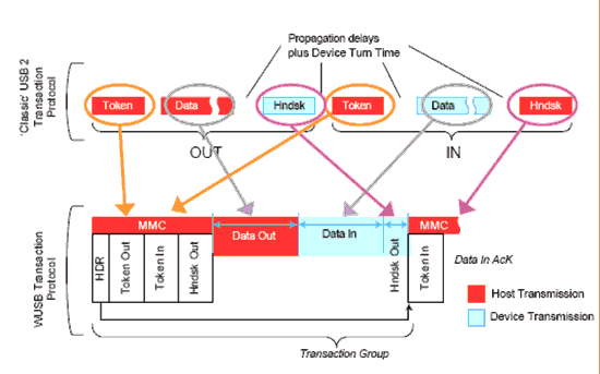 图2是无线USB与有线USB之间事务概念的一个比较图。在USB 2.0中,传入或传出一个设备当中的任何一个数据包都需要来自USB主机的一个令牌。在无线 USB 中,数据传输则以事务组(transaction group)的形式完成。事务组是指微调度管理指令(MMC)与被分配协议时间隙的组合,在时间隙期间执行一个或多个无线 USB 事务。即,对无线 USB,并非每个空中传输数据包都需要一个令牌;一组针对不同端点(EP)管道(甚至是不同设备)的事务可以共享同一令牌。