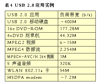 表4是几个当前使用USB并需要大带宽的典型应用实例。通过分析这些实例的带宽需求,就能更好地了解这些应用是否能够完美地配合于无线 USB 框架。