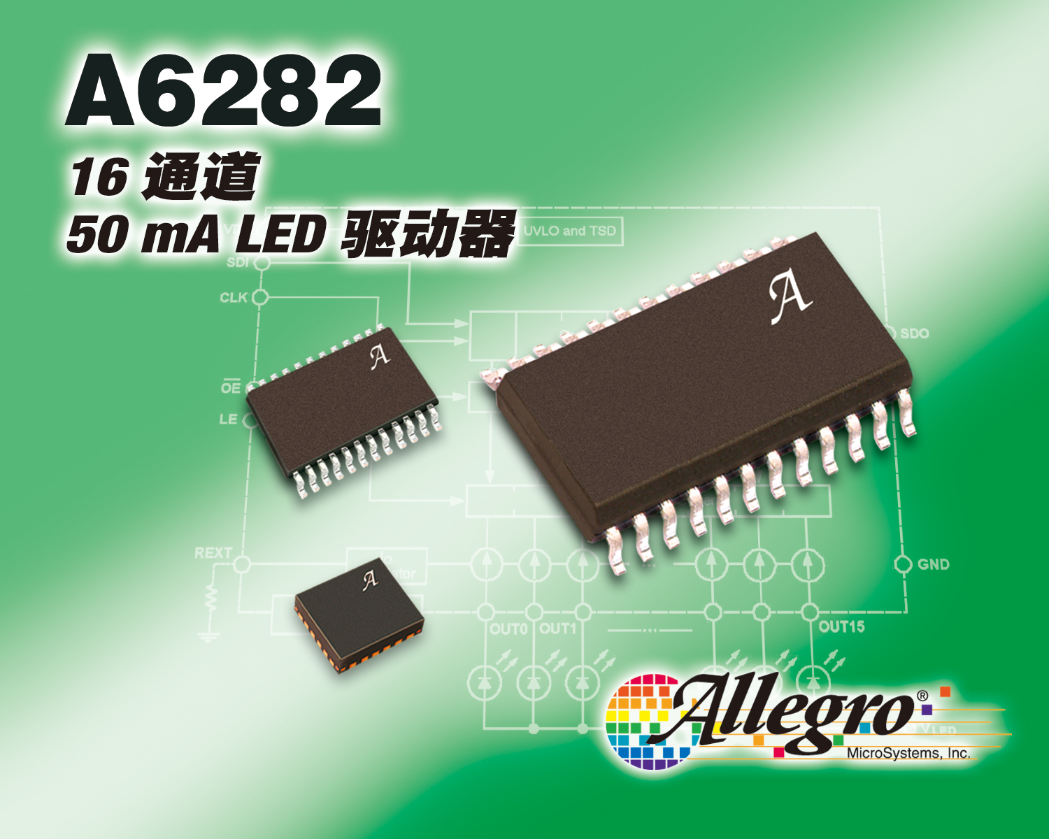 A6282 Allegro MicroSystems 公司推出两款用于显示应用的 16 通道 LED 驱动器 IC 驱动器之优选