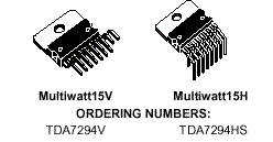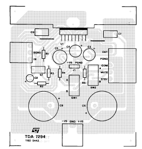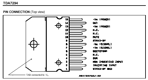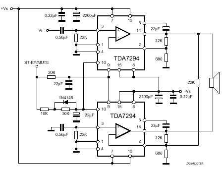 TDA7294是ST意法公司一款新型DMOS大功率音频功放集成电路,它具有较宽范围的工作电压,(VCC+VEE)=80V;较高的输出功率(高达100W的音乐输出功率),并且具有静音待机功能,很小的噪声和失真以及过热、短路保护功能,有关电气参数如下: