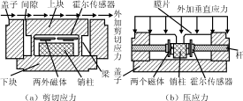 图29 几种霍尔压力传感器的构成原理 3.2.10.2 霍尔应力检测装置 图30示出用来进行土壤和砂子与钢界面上的法向和切向应力检测的霍尔传感器装置。(a)检测向切应力,(b)检测压应力。箭头所指是施加的外力方向。在图30(a)中,仪器上用钢作成上下两个块子,它们之间有两条较细的梁支撑,在钢下块上置一销柱,销上贴两对永磁体,形成均匀梯度磁场,在上块上贴两个霍尔传感器,受剪切力作用后,支撑梁发生形变,使霍尔传感器和磁场间发生位移,使传感器输出发生变化。由霍尔传感器的输出可从事先校准的曲线上查得与该装置相接的砂或土受到的剪切应力。