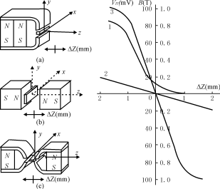 图27 利用霍尔开关锁定器进行方向和转速测定 3.2.10 霍尔位移传感器 若令霍尔元件的工作电流保持不变,而使其在一个均匀梯度磁场中移动,它输出的霍尔电压VH值只由它在该磁场中的位移量Z来决定。图28示出3种产生梯度磁场的磁系统及其与霍尔器件组成的位移传感器的输出特性曲线,将它们固定在被测系统上,可构成霍尔微位移传感器。从曲线可见,结构(b)在Z<2mm时,VH与Z有良好的线性关系,且分辨力可达1μm,结构(C)的灵敏度高,但工作距离较小。