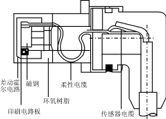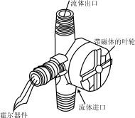 (a)径向磁极(b)轴向磁极(c)遮断式 图24 旋转传感器磁体设置 由此,可对转动物体实施转数、转速、角度、角速度等物理量的检测。在转轴上固定一个叶轮和磁体,用流体(气体、液体)去推动叶轮转动,便可构成流速、流量传感器。在车轮转轴上装上磁体,在靠近磁体的位置上装上霍尔开关电路,可制成车速表,里程表等等,这些应用的实例如图25所示。 图25的壳体内装有一个带磁体的叶轮,磁体旁装有霍尔开关电路,被测流体从管道一端通入,推动叶轮带动与之相连的磁体转动,经过霍尔器件时,电路输出脉冲电压,由脉冲的数目,可以得到流体的流速。若知管道的内径,可由流速和管径求得流量。霍尔电路由电缆35来供电和输出。