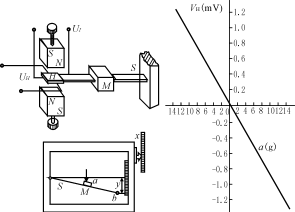 图30 霍尔应力检测装 置 图30(b)的磁体固定在受力后产生形变的膜片上,霍尔传感器固定在一杆上。检测原理同上。应用检测压应力的原理,可构成检测重量的装置,称作霍尔称重传感器。 3.2.10.3 霍尔加速度传感器 图31示出霍尔加速度传感器的结构原理和静态特性曲线。在盒体的O点上固定均质弹簧片S,片S的中部U处装一惯性块M,片S的末端b处固定测量位移的霍尔元件H,H的上下方装上一对永磁体,它们同极性相对安装。盒体固定在被测对象上,当它们与被测对象一起作垂直向上的加速运动时,惯性块在惯性力的作用下使霍尔元件H产生一个相对盒体的位移,产生霍尔电压VH的变化。可从VH与加速度的关系曲线上求得加速度。