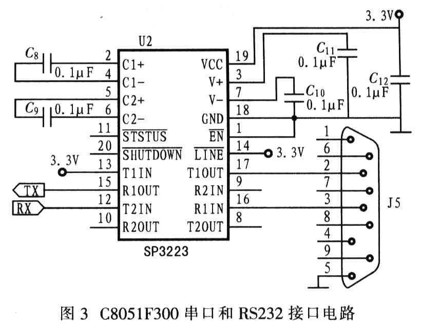 该系统硬件设计主要是由上位机与单片机接口、单片机控制电路和A3992驱动电路组成。其中,上位机主要实现用户与单片机的交互,并通过单片机的串口实现与单片机的通信。图3给出C8051F300串口和RS232的接口电路。