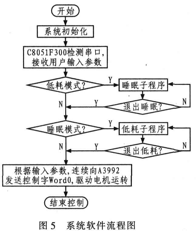 根据系统硬件设计的相关要求设计软件程序,完成系统初始化,接收来自用户的输入指令,控制驱动器按要求运转等功能。具体的系统软件流程设计如图5所示。其中系统初化包括对单片机内的看门狗、I/O端口和A3992的控制字Word0、Wordl参数的初始化。