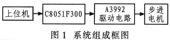图1示出基于A3992和C805lF300控制的两相步进电机驱动系统组成框图。其中,上位机主要完成命令指示等控制功能;C8051F300主要用来接收上位机的指令参数。然后向A3992驱动器写控制字;A3992驱动电路主要完成按接收的控制字向电机提供相应的驱动电流。