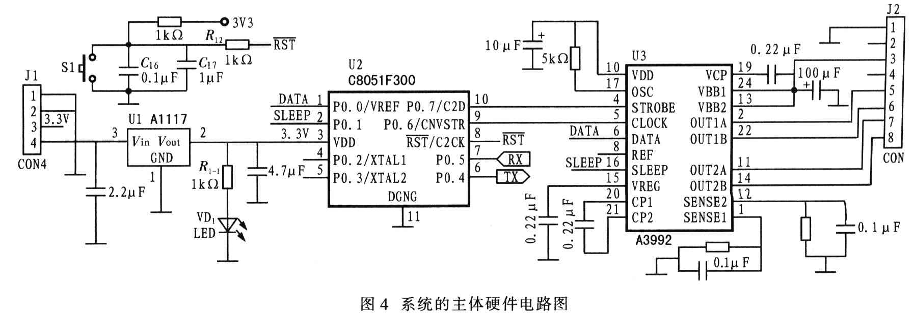 单片机控制电路由C8051F300单片机、供电电源、滤波电容和一系列的I/O端口构成。其中,供电电源采用了A1117稳压器,将5 V输入电压转换成C8051F300适用的3.3 V供电电压,从而保证了供电电源的精度。A3992驱动电路是整个系统的功率部分,接收来自控制电路的信号,两桥桥臂输出满足一定时序的相电流,从而实现驱动步进电机按用户的要求运转。图4所示给出了系统的主体硬件电路。