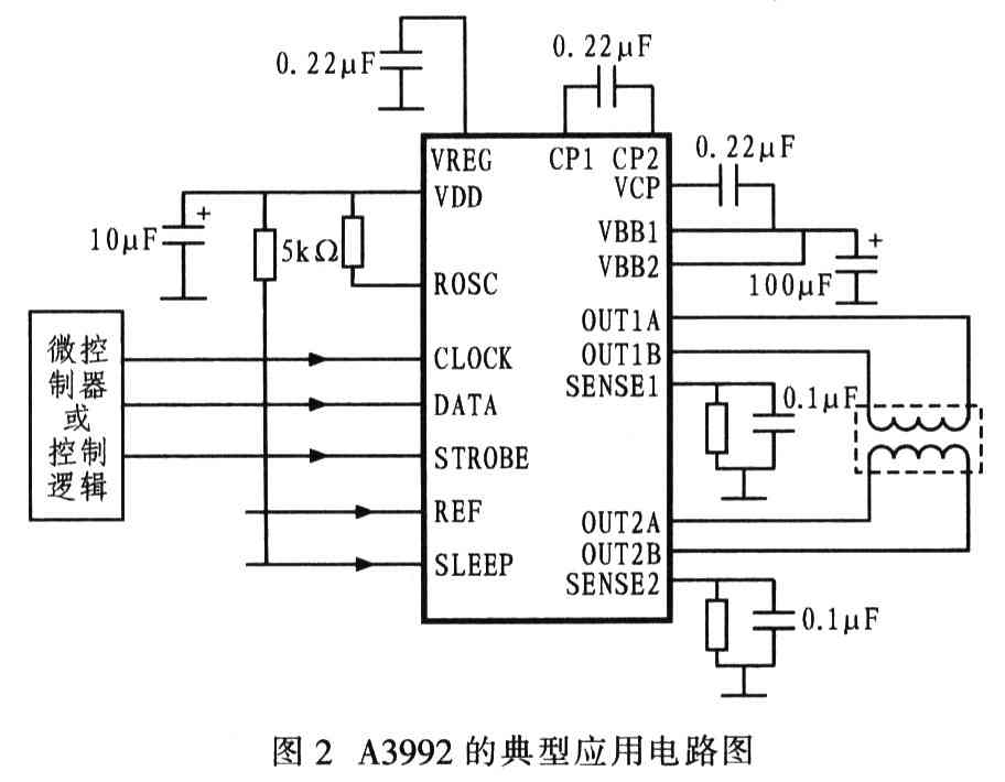 A3992型双DMOS全桥微步距脉宽调制(PWM)步进电机驱动器可利用控制器件通过3线串行接口(CLK,DATA,STROBE)对其进行控制.并能方便地调节步进电机的运转方向,实现各种不同的步进法(从整步驱动到最高可达64细分的微步距驱动),使步进电机的驱动方式具有很大的灵活性。