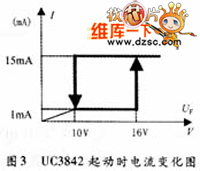 首先由电源通过启动电阻R1提供电流给电容C2充电,当C2电压达到UC3842的启动电压门槛值16V时,UC3842开始工作并提供驱动脉冲,由6端输出推动开关管工作,输出信号为高低电压脉冲。高电压脉冲期间,场效应管导通,电流通过变压器原边,同时把能量储存在变压器中。根据同名端标识情况,此时变压器各路副边没有能量输出。当6脚输出的高电平脉冲结束时,场效应管截止,根据楞次定律,变压器原边为维持电流不变,产生下正上负的感生电动势,此时副边各路二极管导通,向外提供能量。同时反馈线圈向UC3842供电。UC3842内部设有欠压锁定电路,其开启和关闭阈值分别为16V和10V,如图3所示。在开启之前,UC3842消耗的电流在1mA以内。电源电压接通之后,当7端电压升至16V时UC3842开始工作,启动正常工作后,它的消耗电流约为15mA。因为UC3842的启动电流在1mA以内,设计时参照这些参数选取R1,所以在R1上的功耗很小。