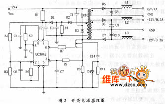 图2所示为笔者在实际工作中使用的电路图。输入电压为24V直流电。三路直流输出,分别为+5V/4A,+12V/0.3A和-12V/0.3A。所有的二极管都采用快速反应二极管,核心PWM器件采用UC3842。开关管采用快速大功率场效应管。