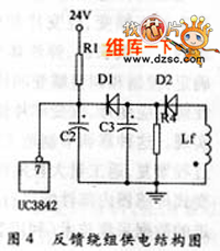 电路如图4所示,电容C2储存的能量要能满足电源开始正常 工作的需要,使得UC3842第7脚有稳定、充足的输入供给。即电容C2的放电时间要大于UC3 842输出脉冲的高电平持续时间。否则,电源将出现打嗝现象。因此,电容C2的容量和 质量的选取非常重要。笔者在实际设计过程中,C2曾用100μF铝电解电容,经常发现 电源打嗝;测量反馈端电压,总是太低,以至于反馈端的整流二极管都没有工作,说明反馈 端电压幅度不够。原因在于C2容量不够,不能提供足够的能量来使UC3842充分工作,因此 ,容量最好在100μF以上。