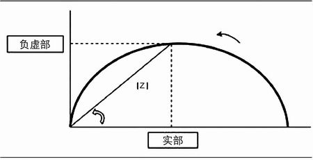 常用的方法是将产生的阻抗与频率的关系曲线作为数据分析的一部分。当频率在给定的范围内扫频时,奈奎斯特(Nyquist)图是在复数平面内以传递函数的实部和虚部为参数的曲线。如果图中的x轴表示实部,y轴表示虚部(注意:y轴取负数),就可以得到每个频率点的阻抗表示。换句话说就是,曲线上的每个点都代表了某个频率点的阻抗。可以从向量长度|Z|和该向量与x轴之间的夹角?计算出阻抗。图1为电阻器和电容器并联时的典型奈奎斯曲线。