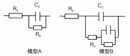 在模型A中电阻器Rs表示金属所在的溶液,而电容Cc表示金属表面的保护涂层或涂料,这表示初始涂层的电容。经过一段时间后,水渗入涂层中形成新的液体和金属界面。随着金属的腐蚀,通过溶液与金属之间的保护涂层形成离子导电路径。这可以用Rx与Cc并联模型来表示。另外,有些模型(模型B)还有一个附加的R和C并联起来再与Rx串联的电路来表示金属保护涂层随着时间变化的分层模型。