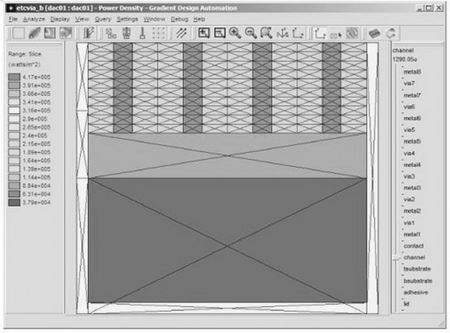 热分析的输出用来更新单个器件以及连接区域的温度。一旦这些信息更新后,器件的功率和寄生值也就得到了修正。这一步骤牵涉到在网表(仿真格式和/或设计格式)和物理实例之间进行一致的名字映射。这种在电路分析和温度分析之间的电热循环用来捕捉热量对电路行为的影响。稳态和暂态问题都可以利用图4描述的流程加以解决。